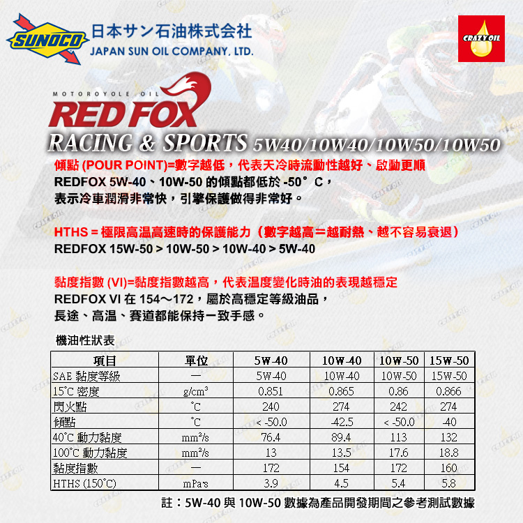 品名 : 日本SUNOCO RED FOX 10W50 機車酯類全合成機油
